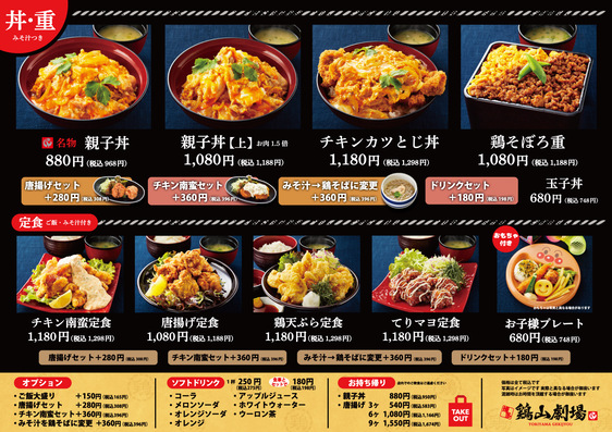“TORIYAMA GEKIJYOU ”是一家供应著名的亲子丼(鸡肉鸡蛋盖饭)的餐厅,其特色在于鸡肉鲜嫩多汁,鸡汤香气浓郁,是用长时间慢火熬制而成。我们还提供来自九州各地的各种鸡肉菜肴,包括炸鸡、南蛮鸡和天妇罗鸡。我们还提供用鸡汤烹制的“鸡肉荞麦面”,作为盖饭和套餐的一部分,期待您的光临。
