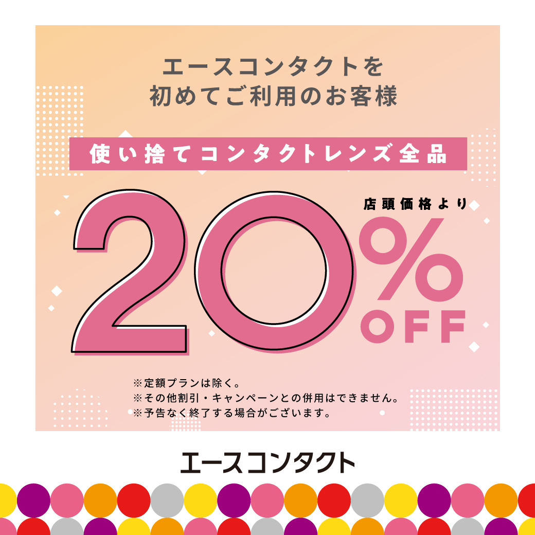 对于首次ACE CONTACT顾客,所有一次性隐形眼镜均可享受店内价格 20% 的折扣!