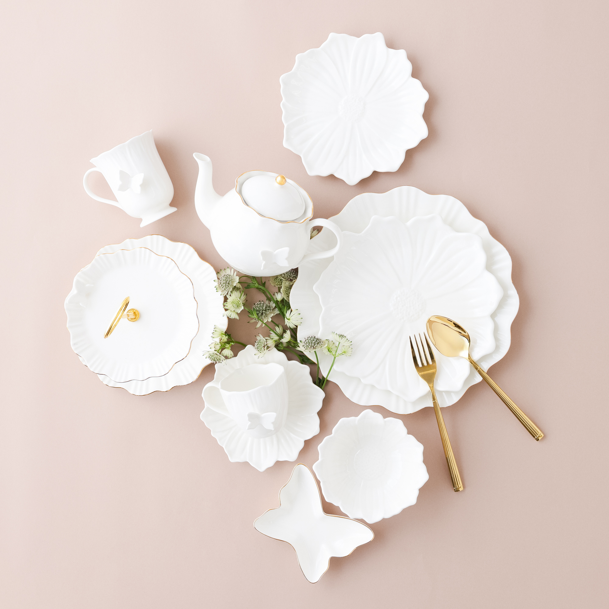 该系列产品包括花卉主题的盘子、杯子和碟子、茶壶、马克杯和蛋糕架。