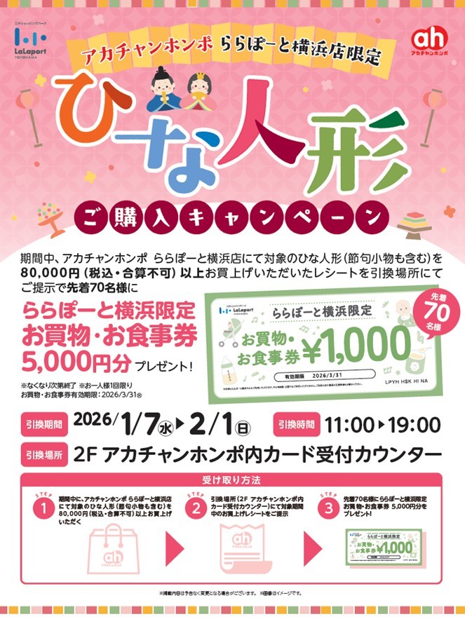 期間中、アカチャンホンポ ららぽーと横浜店にて対象のひな人形(節句小物を含む)を80,000円(税込・合算不可)以上お買い上げいただいたレシートを引換場所にてご提示で