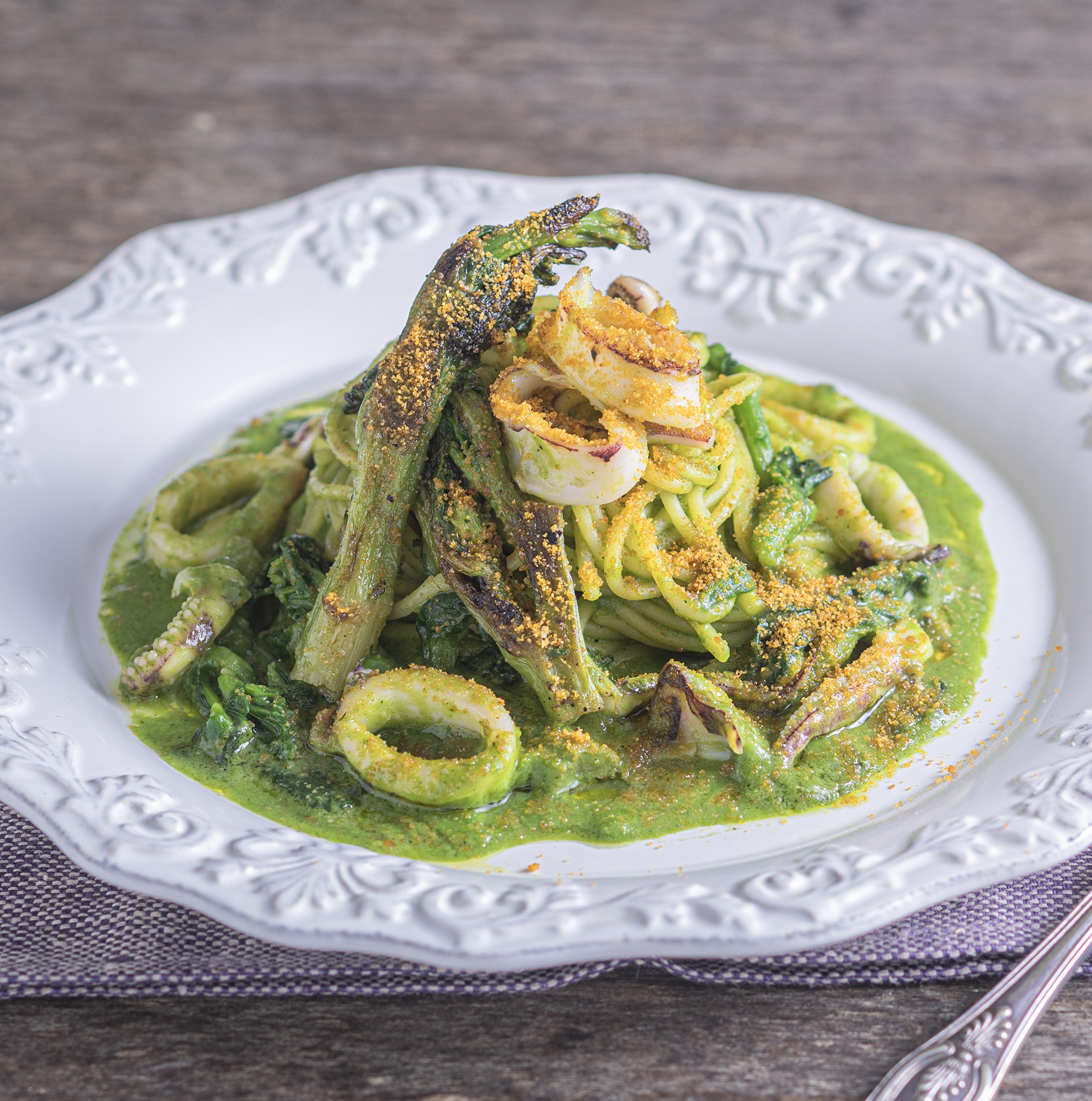 用蒜油翻炒玄界海域捕获的鱿鱼,佐以鲜亮的绿色酱汁。
