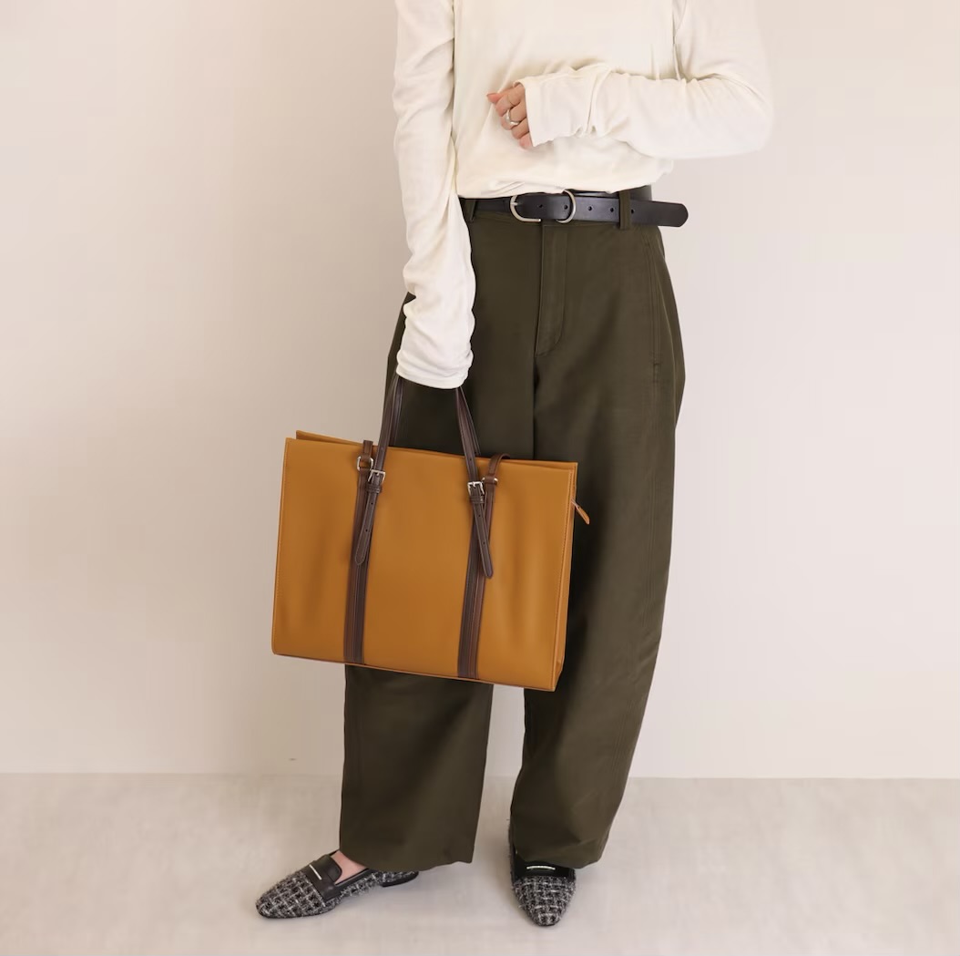 一个大号手提袋,可以装下一个 A4 尺寸的透明文件夹或一台平板电脑。