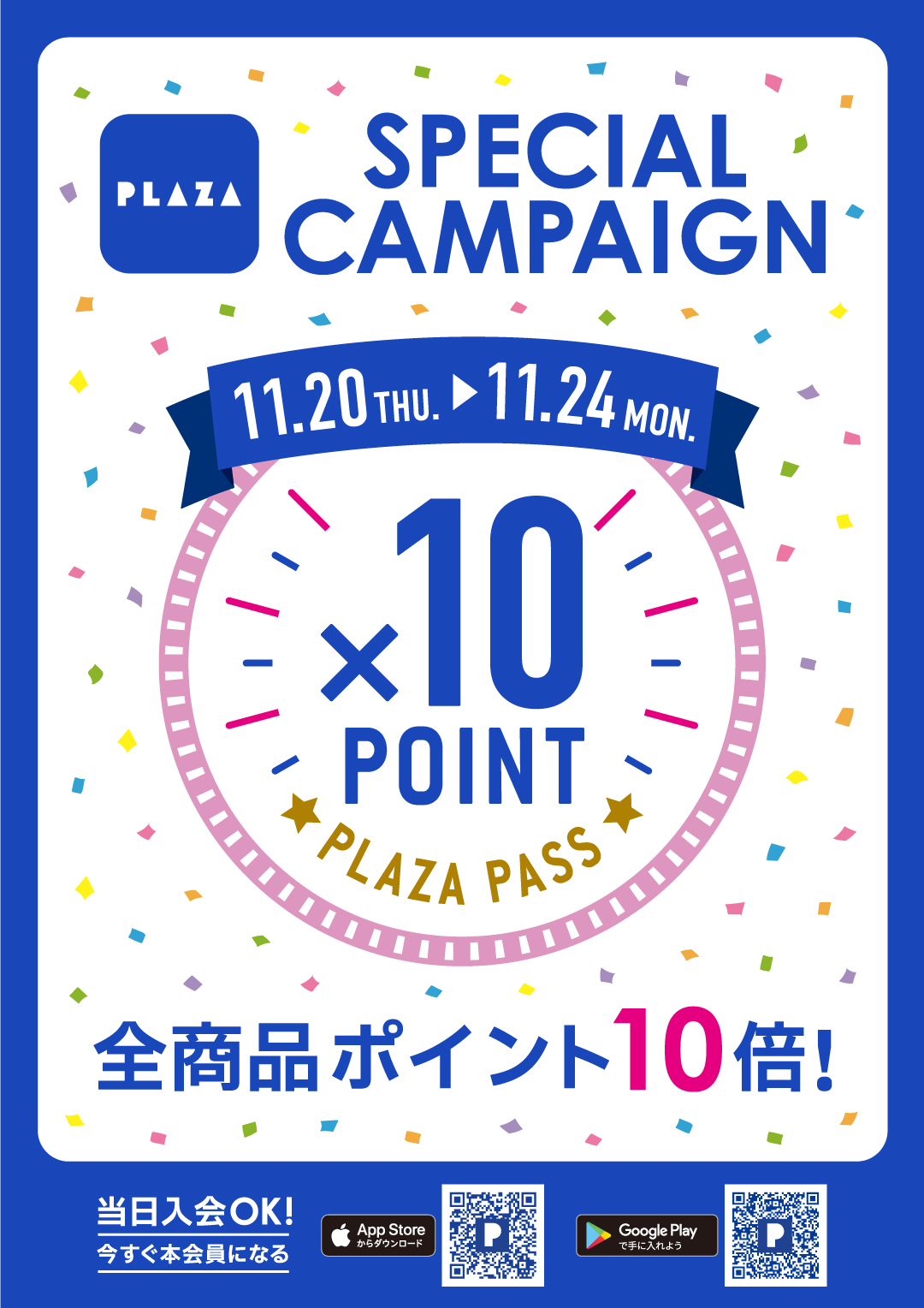 11月20日至24日,在PLAZALala Terrace Kawaguchi,您可以获得10倍的PLAZA积分“PLAZAPASS”。当天加入的顾客也适用此优惠。
