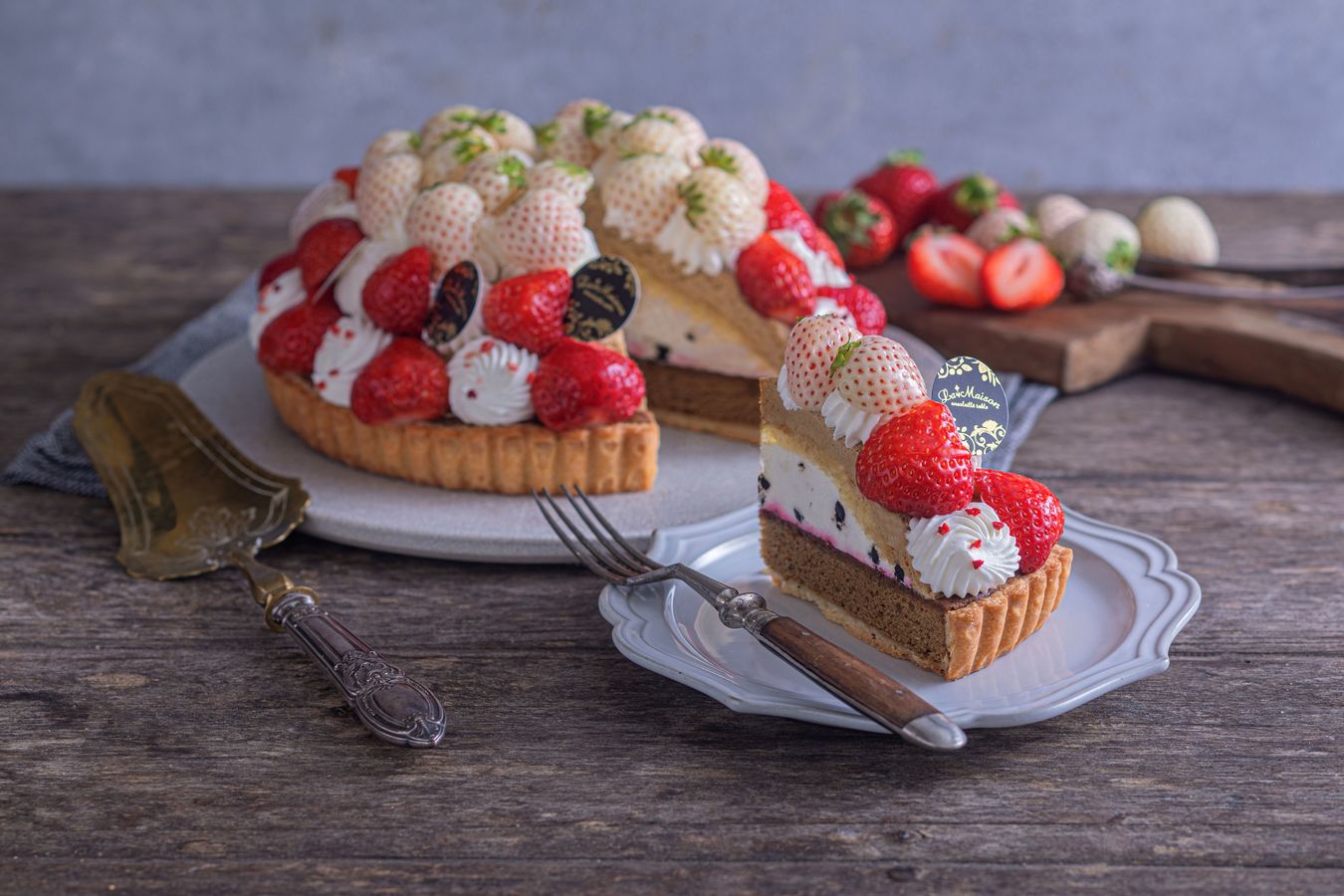 果香浓郁的白草莓和酸甜可口的阿玛乌草莓,搭配ar*奶油和曲奇奶油,层层叠放在红茶蛋糕挞上。
