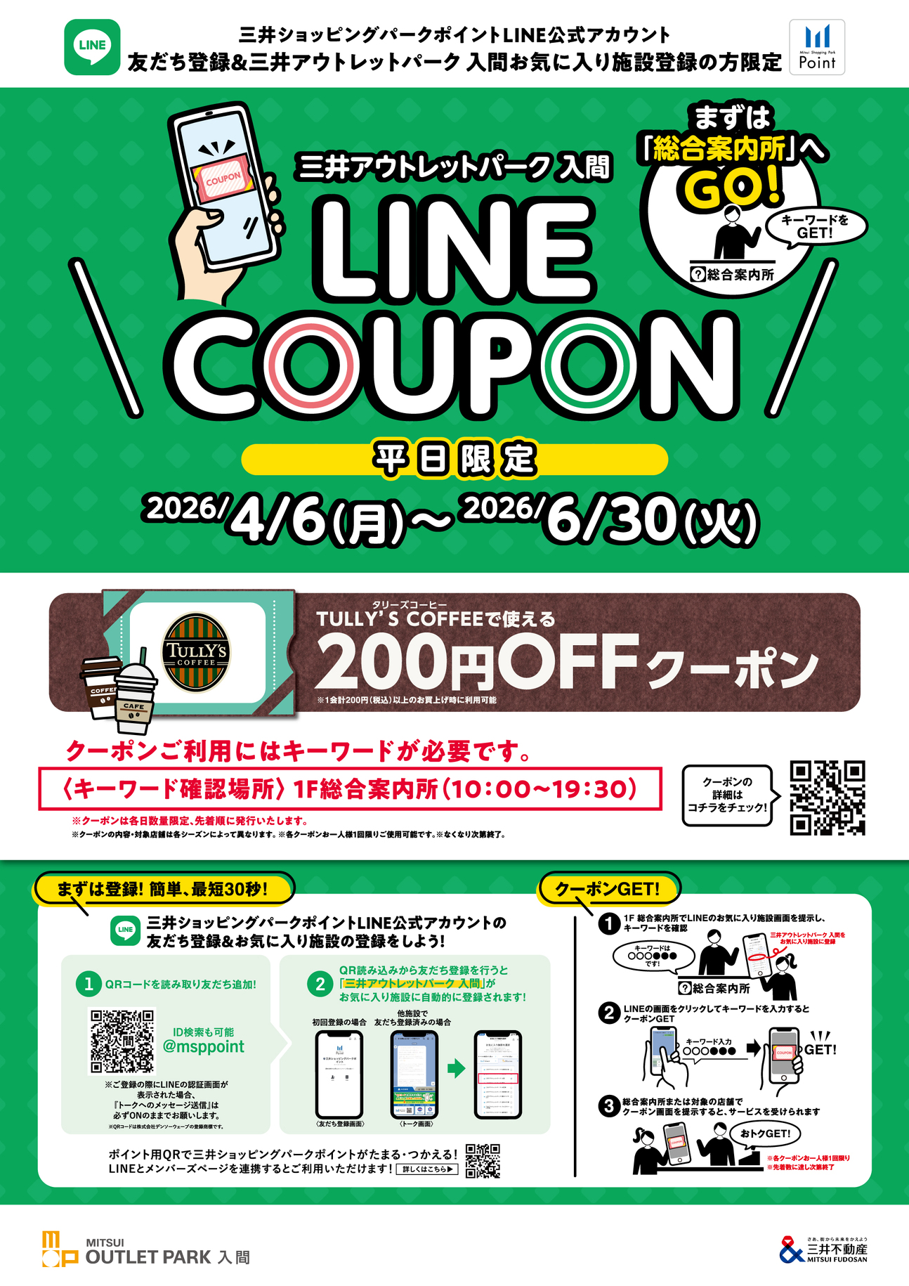 请在三井购物公园Point官方LINE账户上注册三井奥特莱斯购物城入间General Information(10:00-19:30),地址在1楼的Forest Lounge。