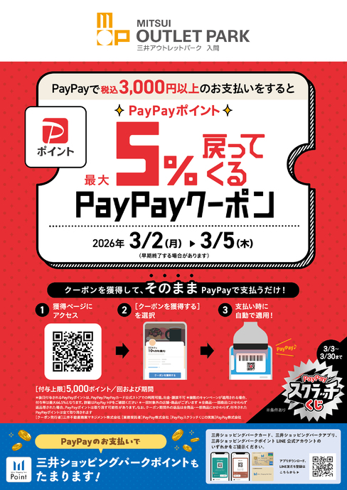 【2026/3/2(月)~3/5(木)】paypay最大5%戻ってくるクーポン