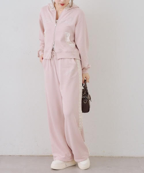 【全新的自己】 成套蕾丝装饰运动裤蕾丝装饰拉链连帽外套