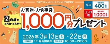 3/13 (周五) ~22 (周日) 当天在2家店铺购物、用餐可获赠“购物、餐券”!