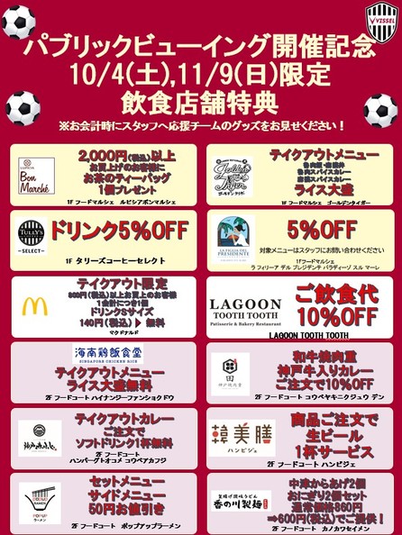 - 【10/4(土),11/9(日)】ヴィッセル神戸パブリックビューイング飲食店舗限定特典!