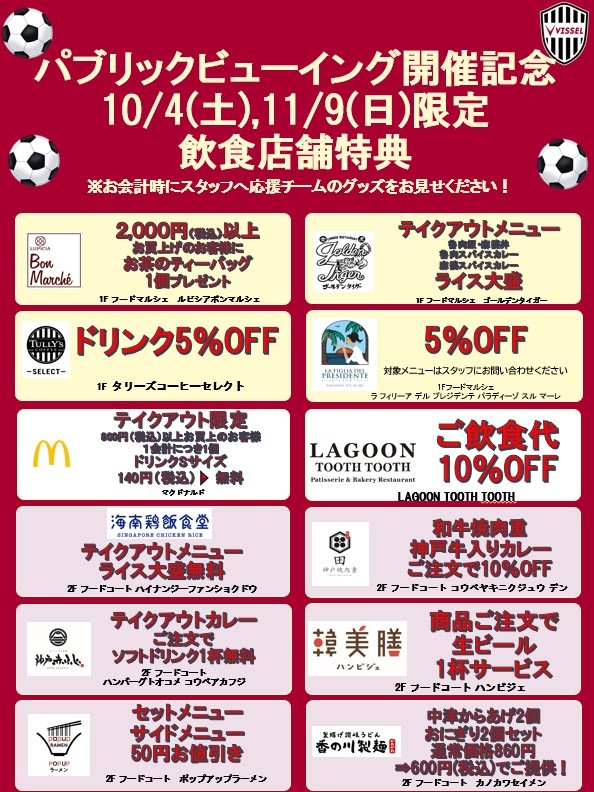 为配合10月4日(周六)和11月9日(周日)两天举行的神户胜利船公众INGNI,部分餐厅将提供特别优惠!!!