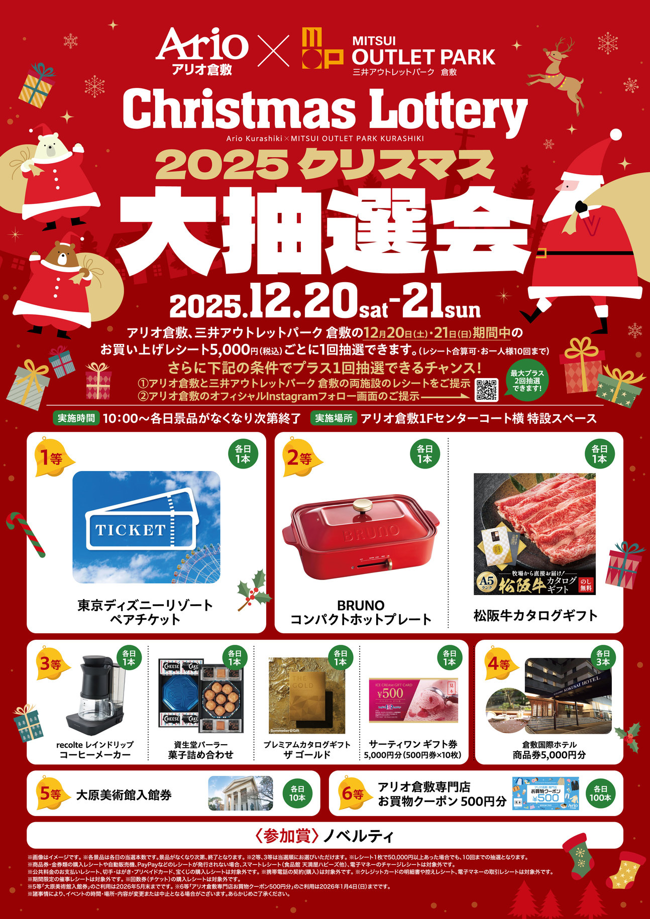 12 月 20 日(星期六)和 21 日(星期日)在 Ario仓敷,三井奥特莱斯购物城仓敷接收购物信息每 5,000 日元一次(含税)您可以参加抽签!