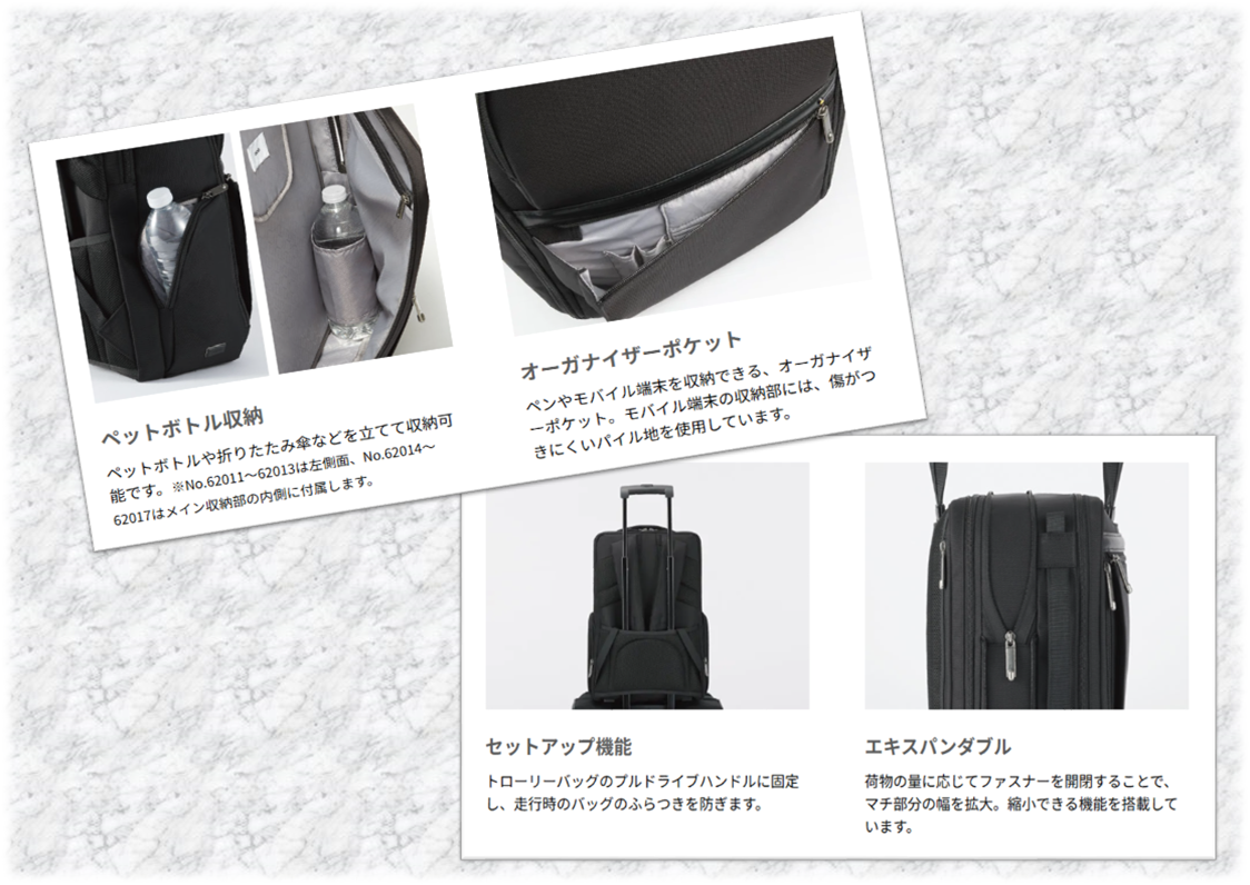 我们有多种可用作公文包或单肩包的两用包,以及可用作背包的三用包。