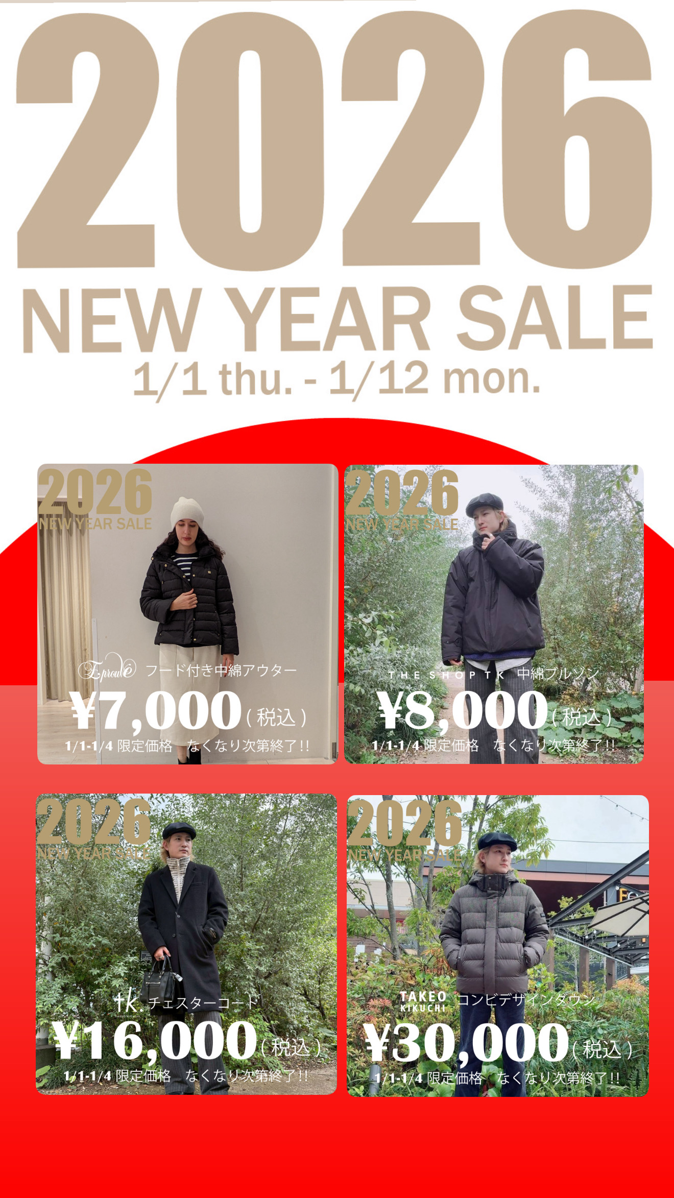 顶部最新信息商店新闻●首卖●数量限定价格!! ●首卖●数量限定价格!! 男士/女士D-SITE 1F WORLD OUTLET ★先到先得!【2026/1/1 (周四) 至2026/1/4 (周日) 限定价格】 ★ 新年特别款人气外套【限定价格】 大放送!元旦开始贩售!售完即止,欲购从速♪ 男士/女士D-SITE 1F WORLD OUTLET世界奥特莱斯 電話番号 043-213-6982 查看图标说明 查看图标说明
