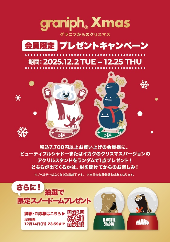 税込7,700円以上お買い上げの会員様に、ビューティフルシャドーまたはイカクのクリスマスバージョンのアクリルスタンドをランダムで1点プレゼント!!