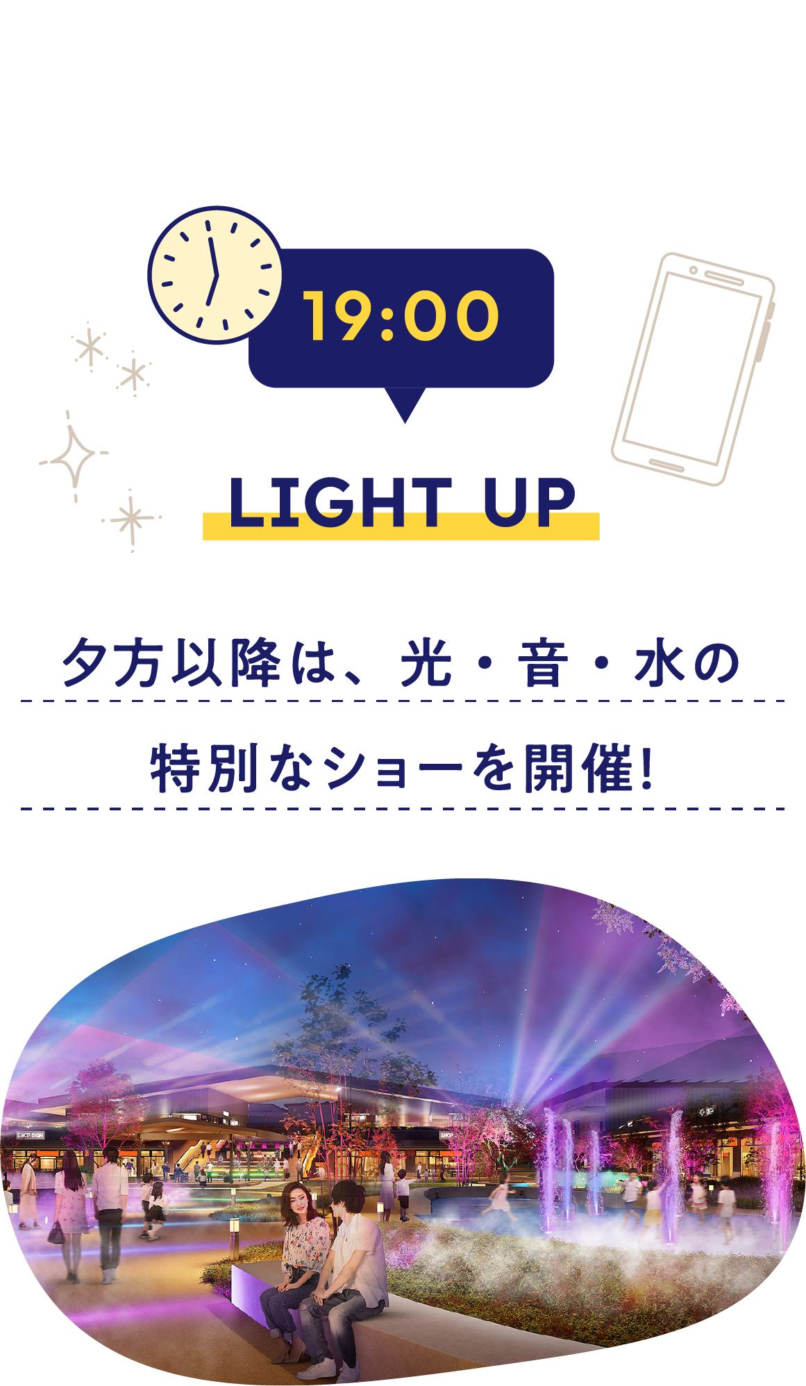 下午 6:00 之后,将定期上演名为“MAGIC HOUR”的特别灯光、音响和水幕表演,使用整个“冈崎MAR”。