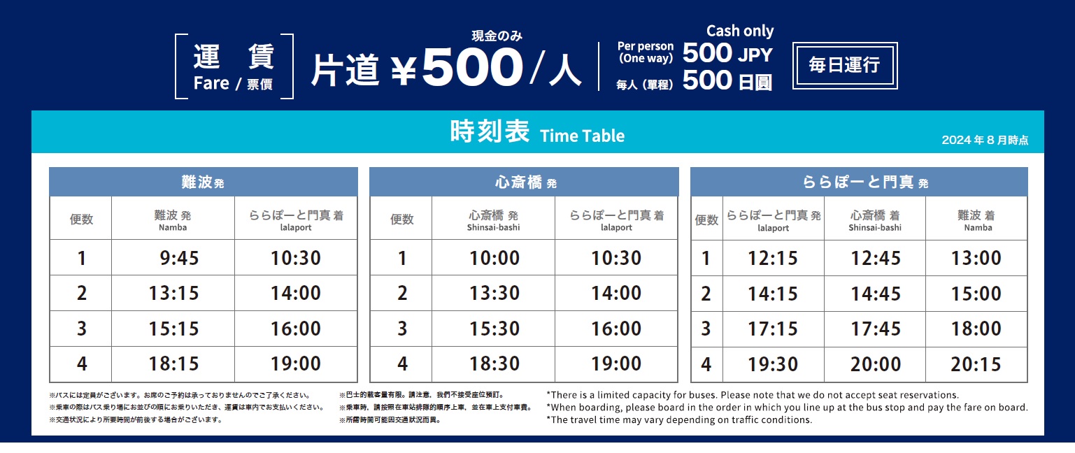 我们在难波、心斋桥、LaLaport和三井奥特莱斯购物城大阪门真之间运营付费巴士。