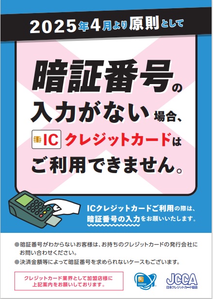 自 2025 年 4 月 1 日星期二开始,使用 IC 信用卡时,将需要输入 PIN 码来验证您的身份。