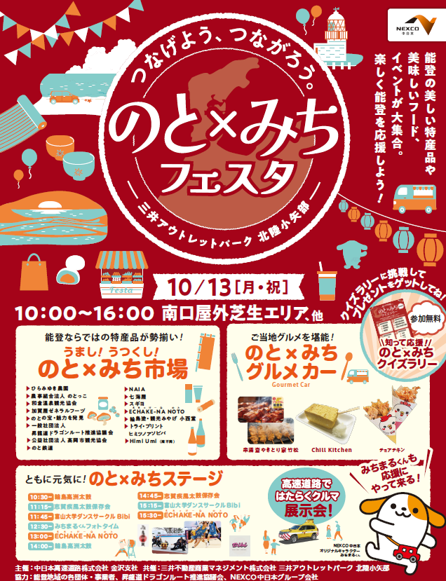 NEXCO中日本金泽店和三井奥特莱斯购物城北陆小矢部将举办“能登x Michi Festa”,这是一项支持能登重建的活动。