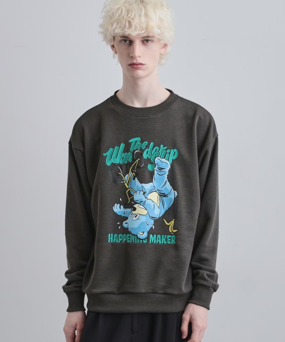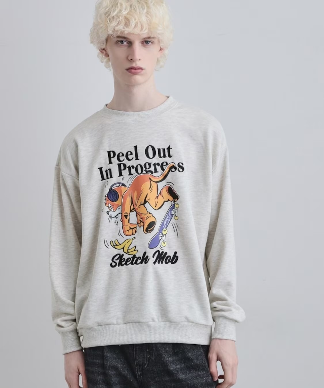 一件趣味十足的图案卫衣,捕捉了身着戏服的角色尝试极限运动并犯下滑稽错误的瞬间。