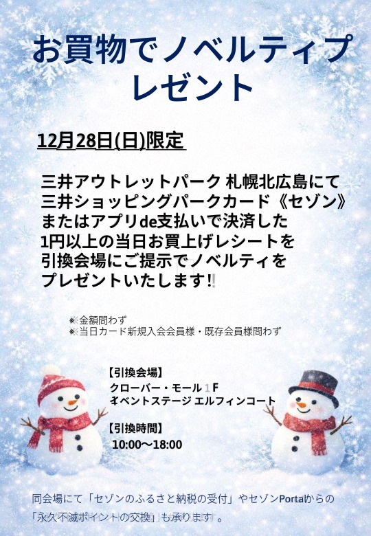 内容:三井ショッピングパークカード《セゾン》またはアプリde支払いで決済した1円以上の当日お買い上げレシートを会場受付スタッフにご提示いただいたお客様へノベルティをプレゼントいたします!