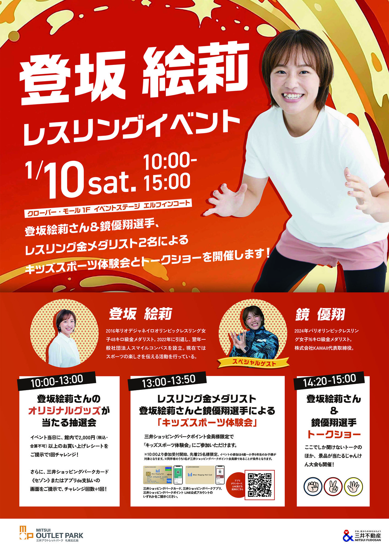 ・13:00-13:50:儿童运动体验活动,摔跤金牌得主户坂绘里和镜祐斗将亲临现场。*仅限三井购物公园会员参加。