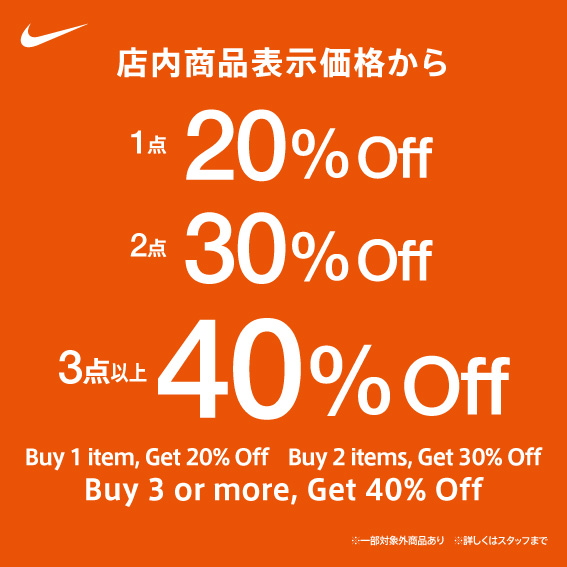 顶部最新信息商店新闻NIKE Factory Store Kitahiroshima 店内商品标价购买1件优惠20%,购买2件以上优惠30%,购买3件以上优惠40% 2月19日 (星期四)至2月23日 (星期一)。 运动&户外Maple Mall 2F Nike 购买1件优惠20%,购买2件以上优惠30%,购买3件以上优惠40%。*部分商品除外详情请咨询店员。 运动&户外Maple Mall 2F Nike耐克 電話番号 011-558-6453 查看图标说明 查看图标说明