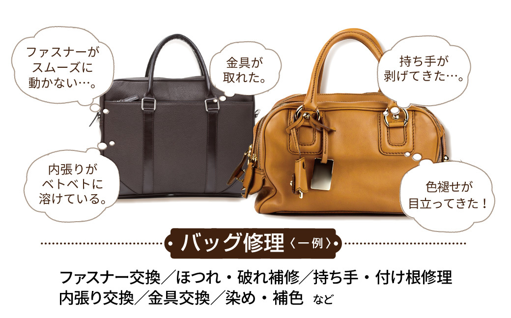 ●拉链修理 ●手柄切割和更换 ●根部修理 ●涂层 ●喷涂/撕裂修理 ●管道修理 ●按扣、标签和填缝剂更换 ●磁铁更换 ●D管和茄子管更换 ●螺丝钉和螺钉更换 ●瓶塞 ●内衬更换等。