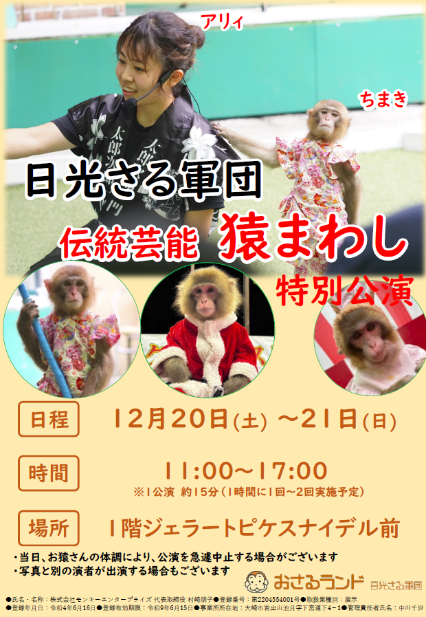 Nikko 猴子表演队将于上午 11:00 在一楼gelato pique /Snidel 前表演传统的猴子表演。