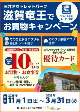 京都信用金庫アプリ「てのひら京信」ユーザー限定!三井アウトレットパーク 滋賀竜王でお買物キャンペーン開催♪