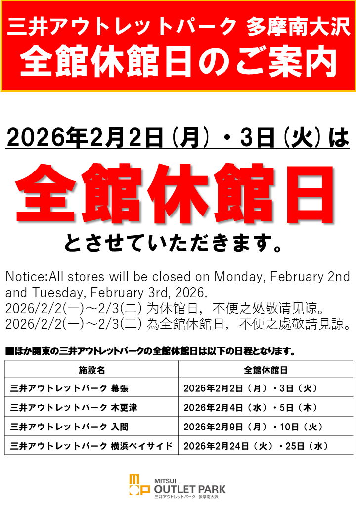 *关东地区的其他三井奥特莱斯购物城将于以下日期休馆日。