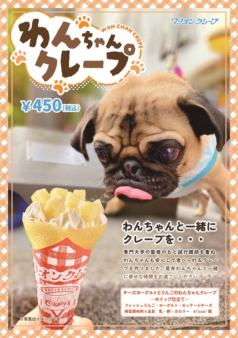 | 品牌概念 | 备有使用香蕉、草莓、牛奶蛋糊等制作而成的经典甜点可丽饼,使用火腿制作而成的餐食可丽饼等20种菜品,以及作为重要家庭的狗狗也能享用的狗狗专用可丽饼! |