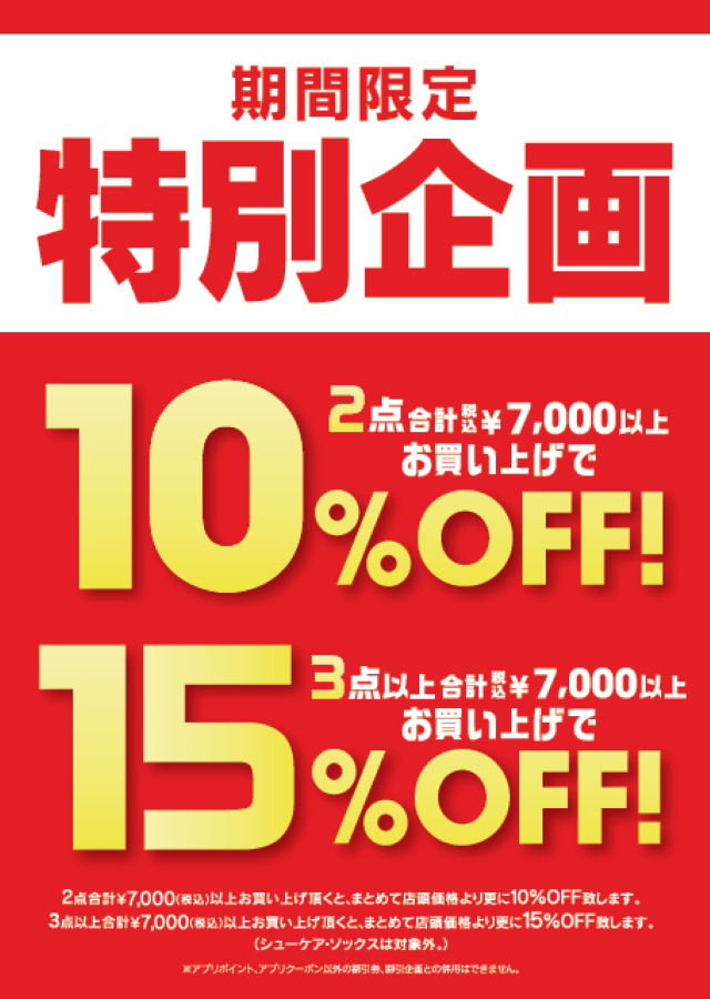 期間限定で2点合計¥7,000以上(税込)お買い上げで10%OFF、3点以上合計¥7,000以上(税込)お買い上げで15%OFFのまとめ買いSALEを実施中。