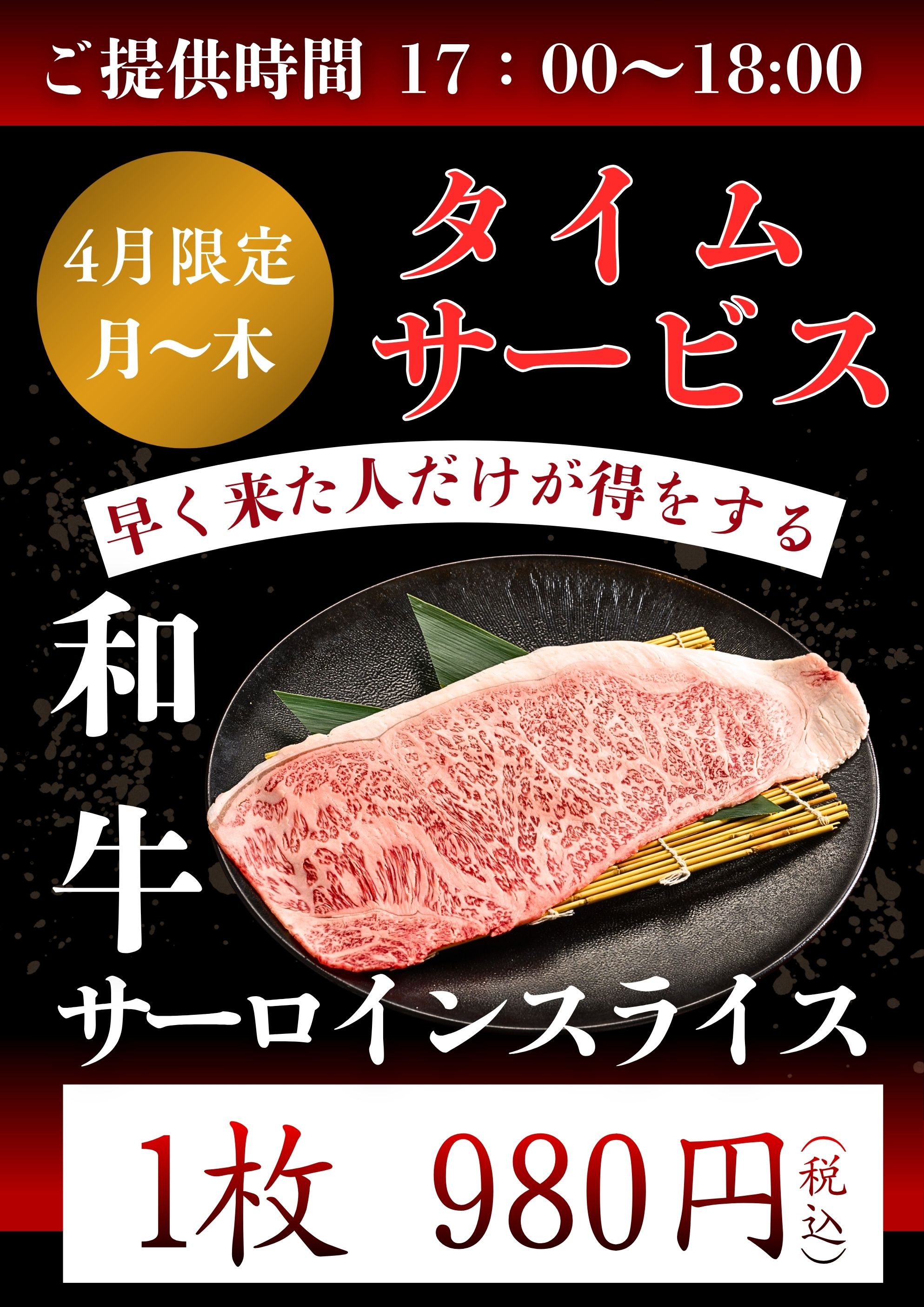 4月の平日月曜から木曜17:00~18:00のご来店で、和牛サーロインのスライスが贅沢にお召し上がりいただけるタイムサービスを実施しております。サッとお焼きいただき、贅沢に一枚を堪能するおすすめ焼肉です。 仕事終わりにサクッと、ちょい飲みのお供に、いつもより早いお食事のタイミングでどうぞご利用ください。