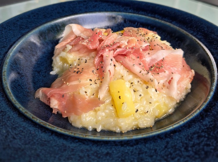“白芦笋奶酪烩饭配国产‘群马小麦猪肉’火腿”