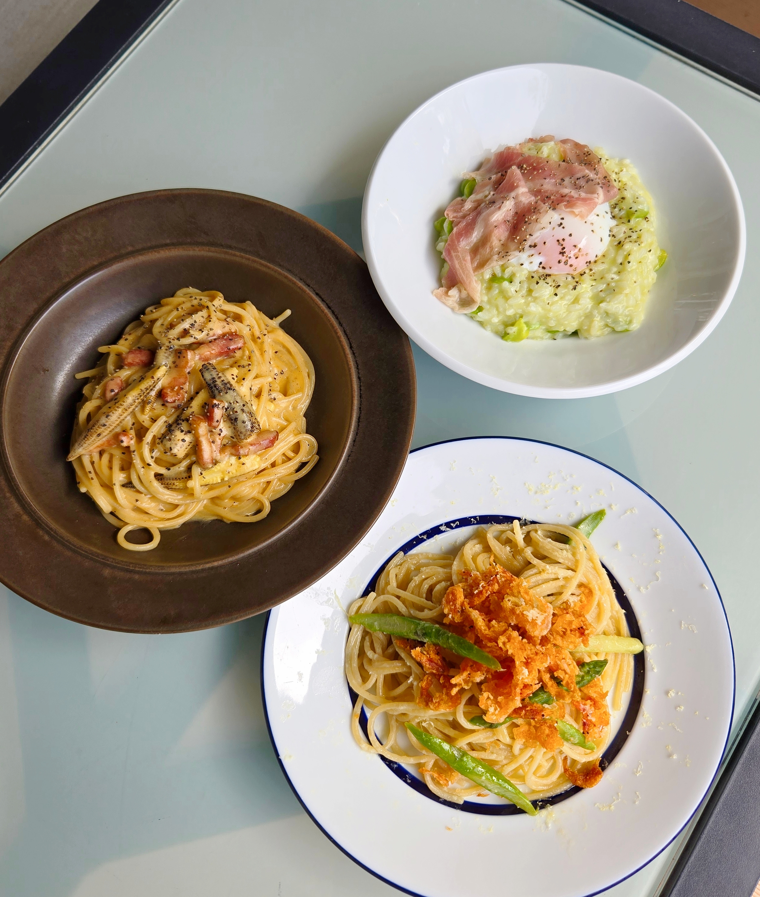 • “柴火烤嫩玉米豆奶黑胡椒卡邦尼意面” 这是一款用当季嫩玉米制作的卡邦尼风味奶油意面。柴火烤嫩玉米的淡淡甜味和培根的咸味被奶酪柔和地中和了。