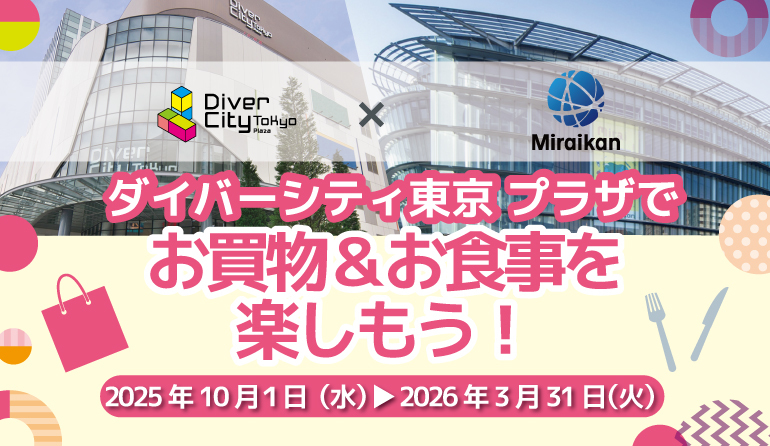 日本科学未来館の当日来場チケットをダイバーシティ東京プラザ3F 総合案内所でご提示いただいたお客様に、ダイバーシティ東京 プラザ キャッシュレス決済限定お買物券200円分と、館内対象店舗で使える「お得クーポン」をセットでプレゼントします。
