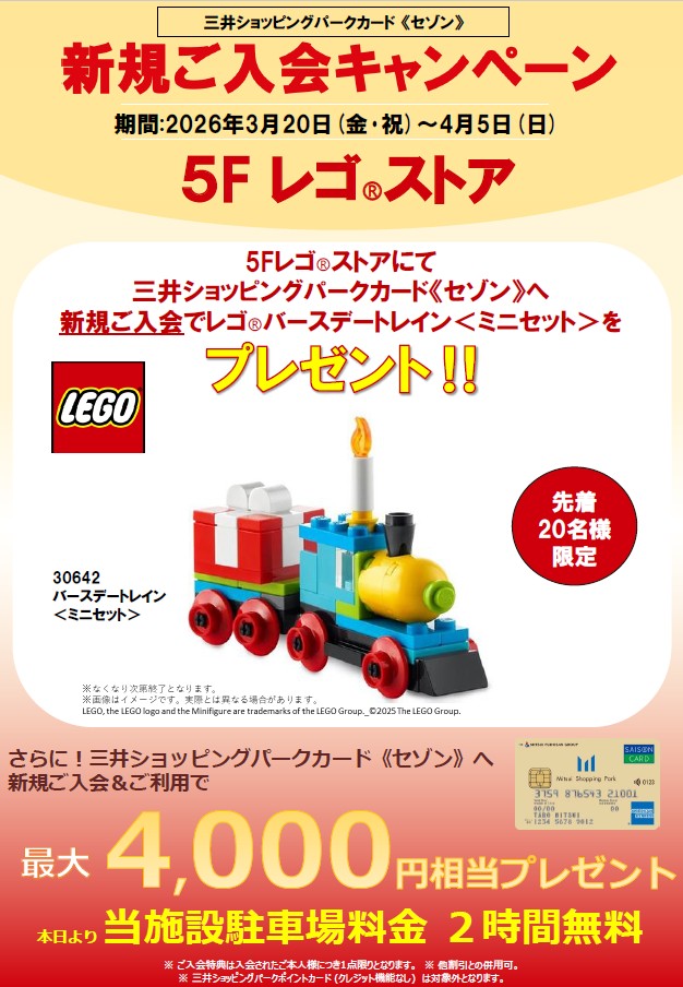 - 5F レゴ ストア 期間限定!三井ショッピングパークカード《セゾン》へ新規ご入会でプレゼントがもらえる!