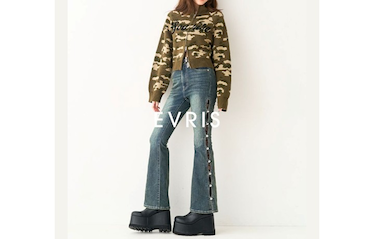 ハイウエストで脚が盛れる美脚効果抜群のフレアデニムから ビジューをあしらったデザインが新登場♡ サイドにビジューをあしらい、ちらっと肌が見えるデザインで そのままはもちろん、レースタイツを中に仕込んでレイヤードを楽しむのもおすすめ!