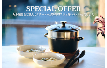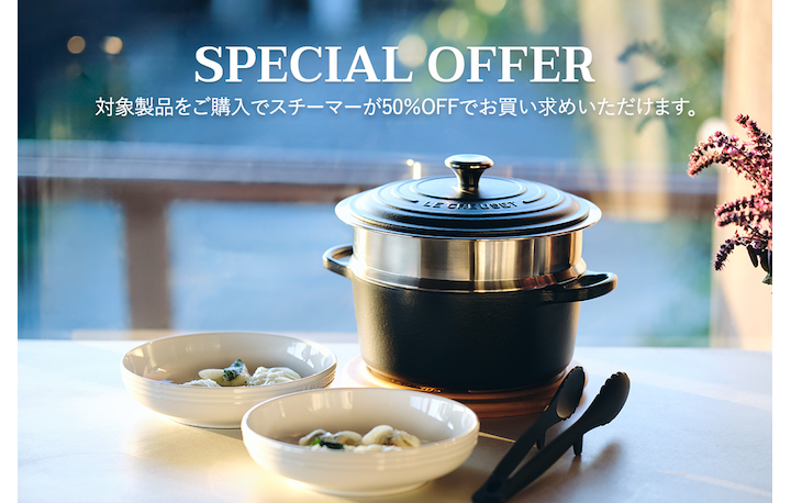 キャンペーン期間中にシグニチャー ココット・ロンド 20cm~24cm、シグニチャー ココット・オーバル 25cmの「マットブラック」または「メレンゲ」カラーをご購入いただいた方は、「スチーマー」を50%OFFでご購入いただけます。