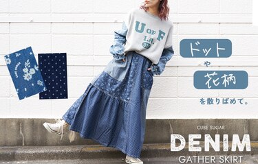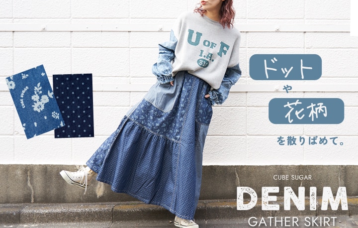 ドットに花柄、そしてデニム……。 女の子の「好き」をぎゅっと詰め込んだ、 リメイク風ギャザースカートが登場しました! 表情の異なるパーツを組み合わせたデザインは、 どこから見ても抜かりない可愛さ。 総柄ではないので派手すぎず、 大人のカジュアルスタイルに程よい甘さをプラスしてくれます。 シンプルなスウェットやTシャツと合わせるだけで、 こなれ感たっぷりのコーデが完成しますよ♪