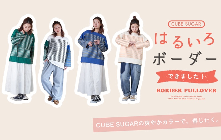 気分まで明るくなるような、 爽やかなカラーのボーダープルオーバーが仲間入り! 定番のボーダーも、CUBE SUGARらしい絶妙な配色で新鮮な印象に。 ゆったりとしたシルエットなので、 一枚でさらっと着ても、 裾からカットソーを覗かせたレイヤードスタイルもおすすめ。 デニムスカートや太めのパンツとも相性抜群です。 お気に入りのカラーを見つけて、 春のコーディネートを楽しんでみませんか?