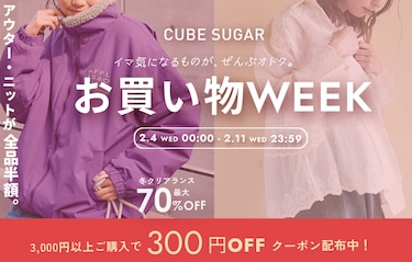 イマ欲しいものが、ぜんぶオトク。 期間限定の「お買い物WEEK」開催スタート! 今回の目玉はなんといっても「アウター・ニット全品半額」! さらに、3,000円以上のご購入で300円OFFになるクーポンもご用意しました。 冬物最終価格の最大70%OFFコーナーも必見です。 在庫限りの早い者勝ちとなりますので、 お早めにチェックしてくださいね!