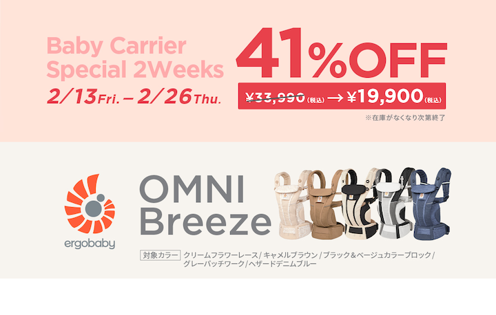 前向き抱きも楽しめるErgobaby OMNI Breeze! 2/26(木)までの期間中、 対象カラーを19,900円(税込)にて販売中☺ ■対象カラー:5色 クリームフラワーレース、キャメルブラウン ブラック&ベージュカラーブロック、 グレーパッチワーク、ヘザードデニムブルー ※在庫がなくなり次第終了 これからご出産の方はもちろん、 買い替えをご検討中の方もぜひこの機会をご利用ください♪