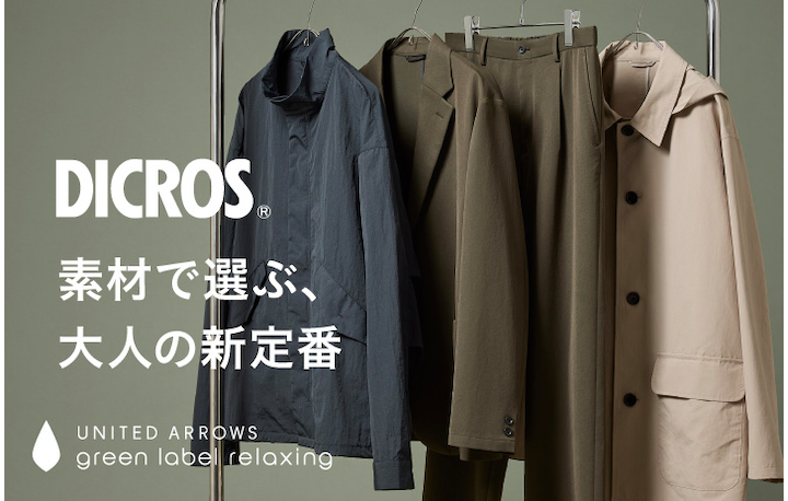 福井・第一織物の匠の技が生み出す、高密度素材「DICROS」。 端正な表情と質感を活かし、 グリーンレーベル リラクシングが大人の日常に馴染む一着へと仕立てました。 いま選びたい、これからの新定番となる全4型をご紹介します。