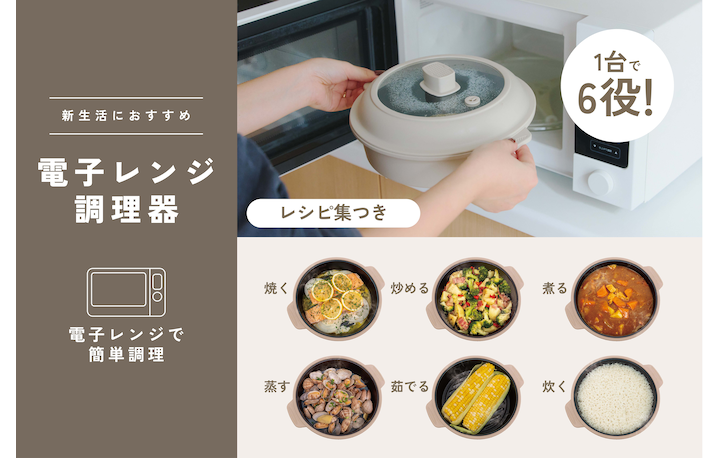 新しい暮らしのスタートに。 電子レンジ調理器が、毎日の食事づくりをぐっとラクにしてくれます。 火を使わず手軽に一品作れる、頼れるアイテムです。