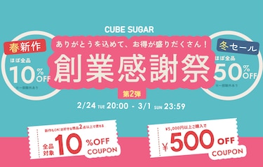 「冬服も欲しいけど、そろそろ春物も気になる…」 そんな欲張りな願いを叶える、とってもお得な期間です。 春の新作を10%OFFでお得に先取り! CUBE SUGARらしいカラフルな新作も、今なら感謝祭価格でGETできちゃいます。 クーポン利用を忘れずに! 新作もOKな「2点以上で10%OFF」や「500円OFF」クーポンで、まとめ買いが断然おトク。 期間は 3/1(日) 23:59まで! 人気アイテムは早い者勝ちですので、ぜひお早めにチェックしてくださいね。
