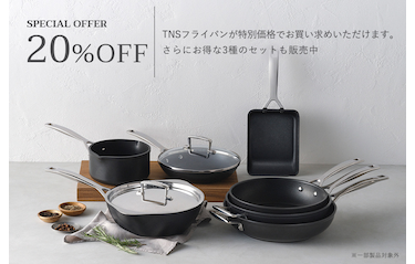 優れた熱伝導率と耐久性が特長の「TNS」シリーズの対象商品を特別価格でお買い求めいただけます! TNSは、特殊加工で強化したアルミニウムに高品質なノンスティック加工を施した製品です。 熱伝導がすばやく均一であるため熱ムラがありません。また少ない油分でも材料がこびりつかず、ヘルシーな料理が可能です。 調理やお手入れも簡単で日々のお料理に気軽に便利にお使いいただけます。 【期間】 2026年3月4(水) 10:00 ~ 4月7日(火) 23:59 【対象商品】 *TNS シャロ―・フライパン NC 20cm~28cm *TNS ディープ・フライパン NC 24cm~28cm *TNS シェフズパン・ダブルスパウト 24cm NC (フタ付き) 更に!期間中はTNS特別セットもご用意✨ シーンに合わせてサイズや形を使い分けてお料理を楽しみましょう♪ 【限定特別セット】 *TNS ミルクパン 16cm NC & TNS シャロー・フライパン 22cm NC セット 22,000円(税込み) *TNS エッグパン NC & TNS ディープ・フライパン 24cm NC & TNS ガラスフタ 24cm セット 27,500円(税込み) *TNS シャロー・フライパン 26cm NC & TNS ディープ・フライパン 26cm NC & TNS ガラスフタ 26cm セット 33,000円(税込み) このお得な機会をお見逃しなく!