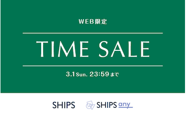 日頃よりSHIPSグループをご利用いただき、誠にありがとうございます。 3月1日(日)23:59まで、WEB限定のタイムセールを開催いたします。 期間限定で対象商品がお求めやすくなります。 この機会をお見逃しなく! ■開催日:2026年2月26日(木)0:00~3月1日(日)23:59 ※掲載商品は一部になります。