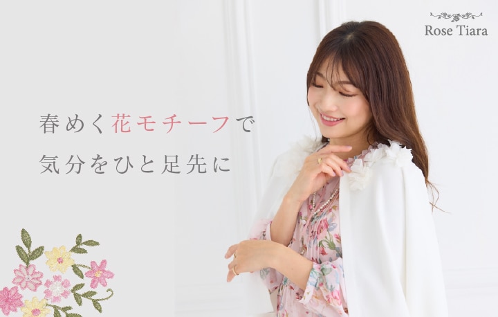 花柄やフラワー刺繍など、華やかなモチーフをまとって、春を先取り。 フェミニンなカラーと軽やかな素材感で、心までやさしく愛らしいスタイルを。