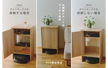 お掃除ロボットの定位置は、すっきり隠せる収納キャビネットの中に。 使うときも、使わないときも、お部屋に自然となじみます。 空間をすっきり見せてくれるのも、うれしいポイントです。
